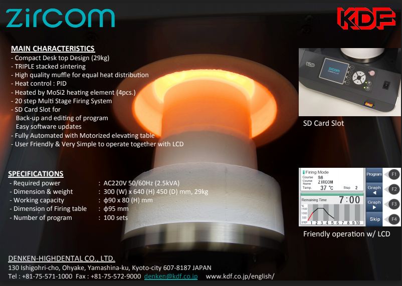 Zircom Sintering Furnace delivers delicacy and beauty to your zirconia. It features molybdenum disilicide heater that provides clean, reliable, and consistent results. Zircom is very compact with size of 12 (W) x 25 (H) x 18 (D) inch and it is also user-friendly with very simple operation. The unit is applicable to various types of zirconia materials.